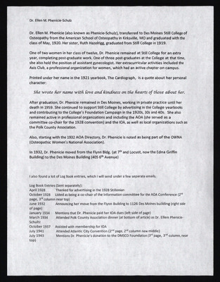 A typed life biography of Dr. Ellen M. Phenicie-Schulz, a Still College of Osteopathy alumnus class of 1920 and post-graduate class of 1921. This document includes a copy of Dr. Phenicie-Schulz's obituary.