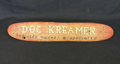 A wooden, rounded sign with the words "Doc Kreamer, bed-side manner a specialty" painted on the front.