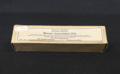 An empty, small package that once held Mercury Ammoniated 10% produced by The Upjohn Company.