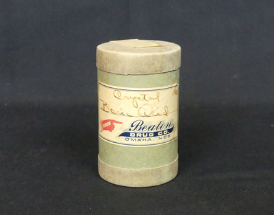 A cylinder package labeled Crystal Boric Acid produced by Beaton Drug Co.