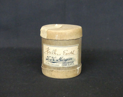 A cylinder package labeled Fullers Earth produced by F. H. Morgan Druggist.