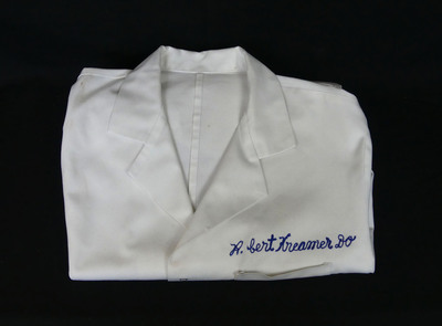 A white laboratory coat that was worn by Dr. Robert Kreamer. His name is hand-stitched above the coat breast pocket in blue floss.