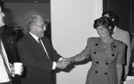 Leonard Azneer shaking a woman's hand during the Spring 1988 graduation ceremony.