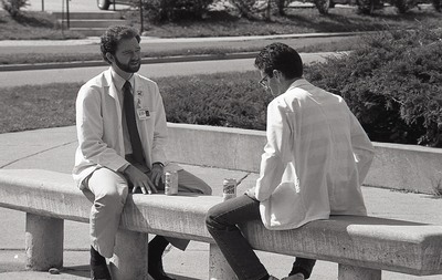 Two students in white coats sitting on a bench in front of academic center.