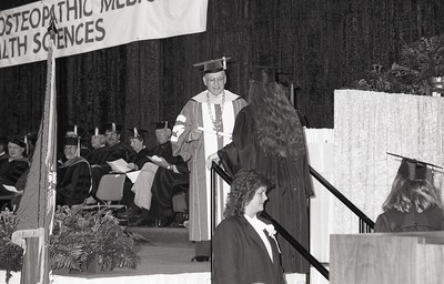 Leonard Azneer presenting a diploma during the Spring 1986 graduation ceremony at Convention Center.